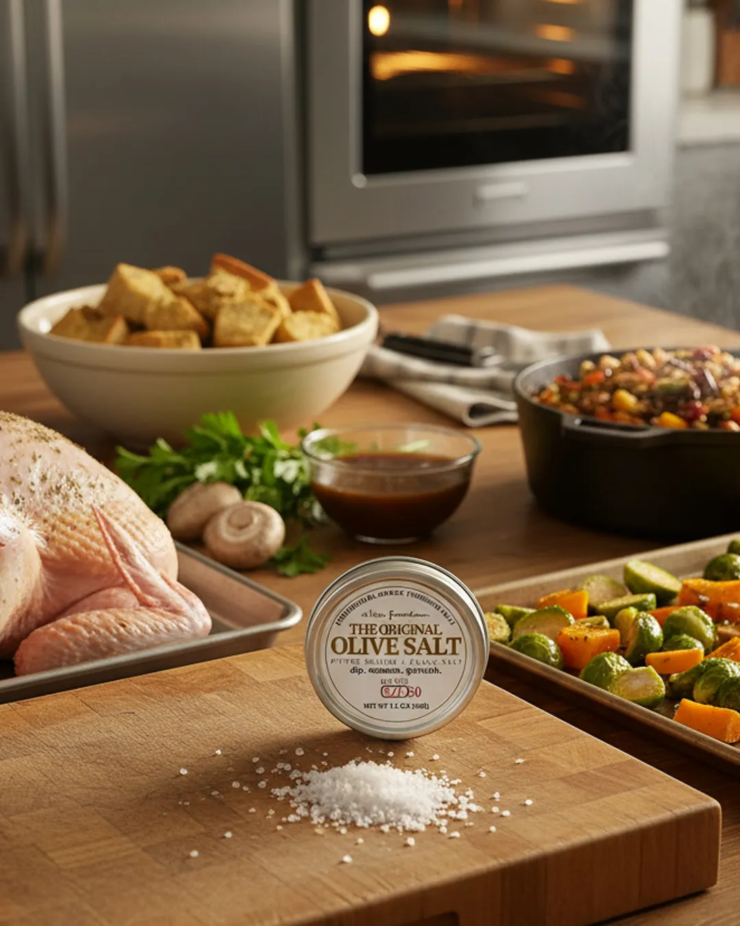 For your turkey: Dry-brine it 48 hours ahead. Coat it with coarse salt, dried herbs, and roasted garlic sea salt. Leave it uncovered in the refrigerator. The salt seasons deeply while the skin dries.