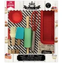 Includes: 1 silicone loaf pan, 1 silicone whisk, 1 silicone rolling pin, 1 silicone spatula, 1 silicone pastry brush, 1 silicone mixing spoon, 6 silicone cupcake liners and 5 recipe cards.